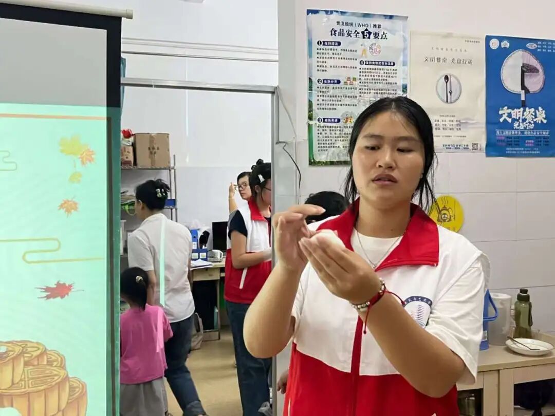 最令人期待的环节是冰皮月饼制作环节,支部入党积极分子化身为“月饼师傅”,为现场的家长和小朋友耐心讲解冰皮月饼的制作流程,指导小朋友们揉面团、包馅料、压模具,从“掌心揉匀冰皮”到“小心捏紧收口”,每一个操作细节都细致示范。入党积极分子们将材料分发给亲子家庭,小朋友们兴奋地围在桌前,迫不及待地动手尝试,家长在旁耐心指导,现场欢声笑语不断。