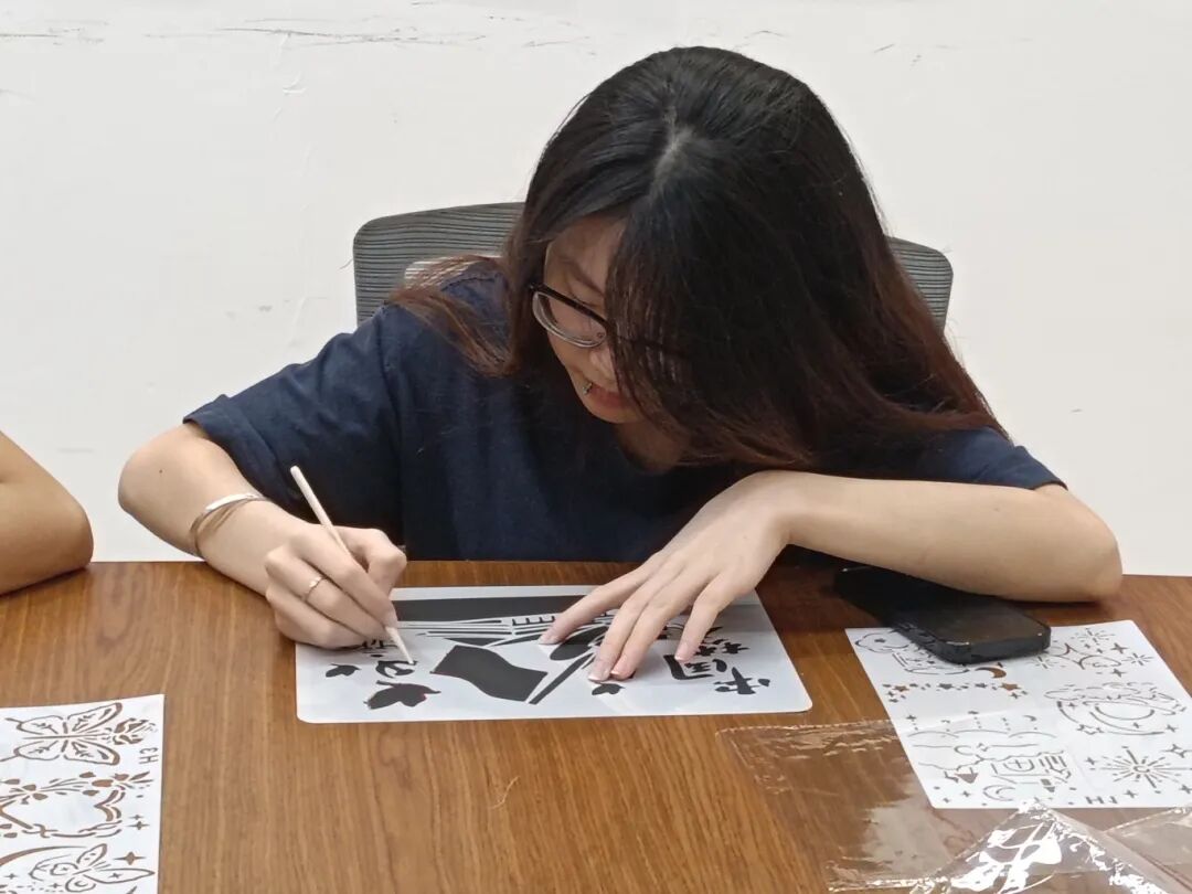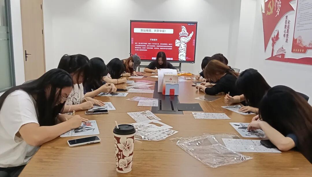 作为视觉传达设计专业的特色实践环节,创意刮画成为本次活动的亮点。团员们手持刮画笔,在墨色涂层纸上细细勾勒——天安门的巍峨轮廓、飘扬的五星红旗、璀璨的节日烟花等元素渐次显现,原本单调的黑色卡纸蜕变为一幅幅绚丽多彩的爱国画卷。创作过程中,团员们相互交流技法、分享灵感,将专业所学与爱国情感紧密结合,每一道线条都凝聚着对祖国的深情祝福,每一抹色彩都彰显着青春的蓬勃力量。