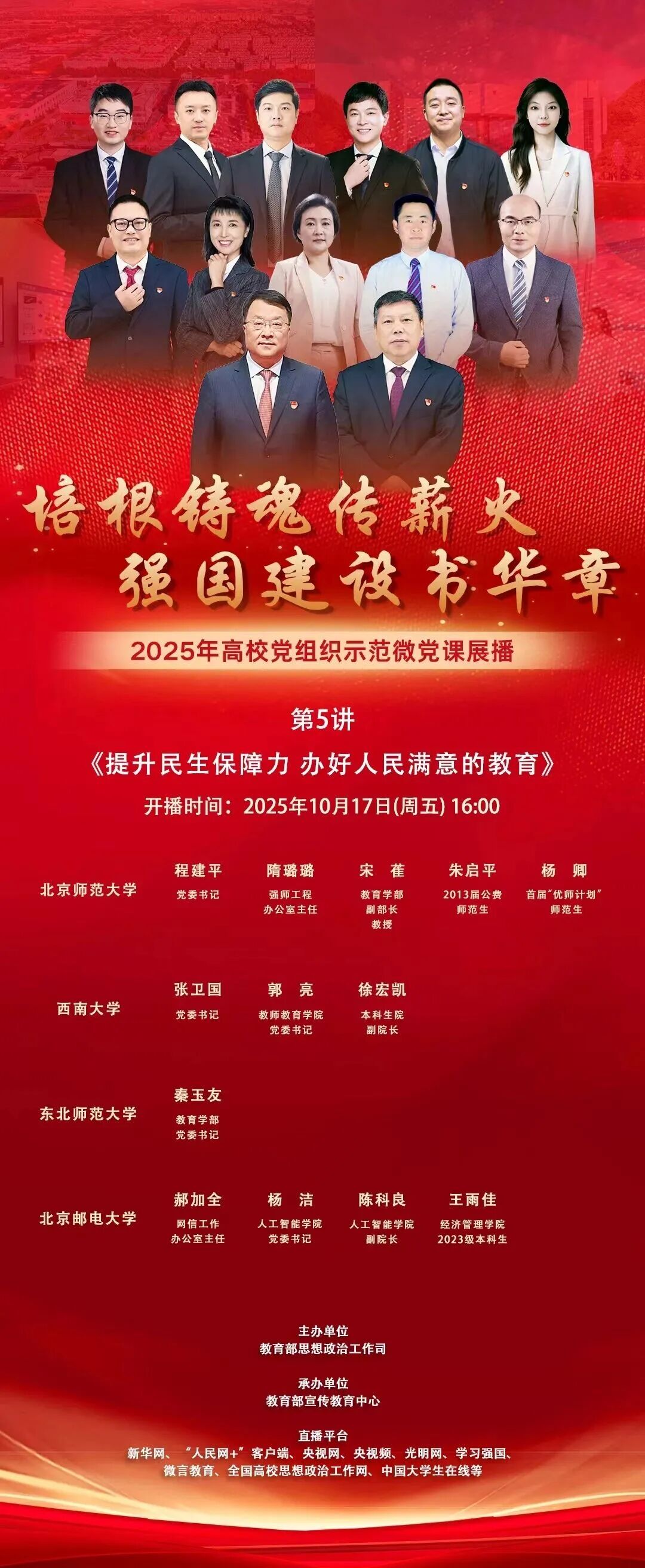 本次微党课以“培根铸魂传薪火,强国建设书华章”为总主题,跟随北京师范大学、西南大学、东北师范大学、北京邮电大学师生党员的视角,聚焦三大核心内容: