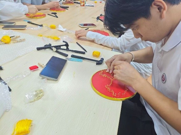 创作现场,党员们专注投入、默契协作。测量钉距时分毫必较,固定铁钉时稳扎稳打,缠绕丝线时反复调整——每一颗铁钉都承载着对先烈的敬仰,每一根丝线都串联着对历史的铭记。有的以炽热红为主调,勾勒祖国的疆土;有的将党徽与和平鸽融入画面,传递“以战止战、珍爱和平”的深层寓意。指尖翻飞间,冰冷的铁钉与柔软的丝线碰撞出艺术火花,抽象的红色记忆转化为具象的视觉作品。