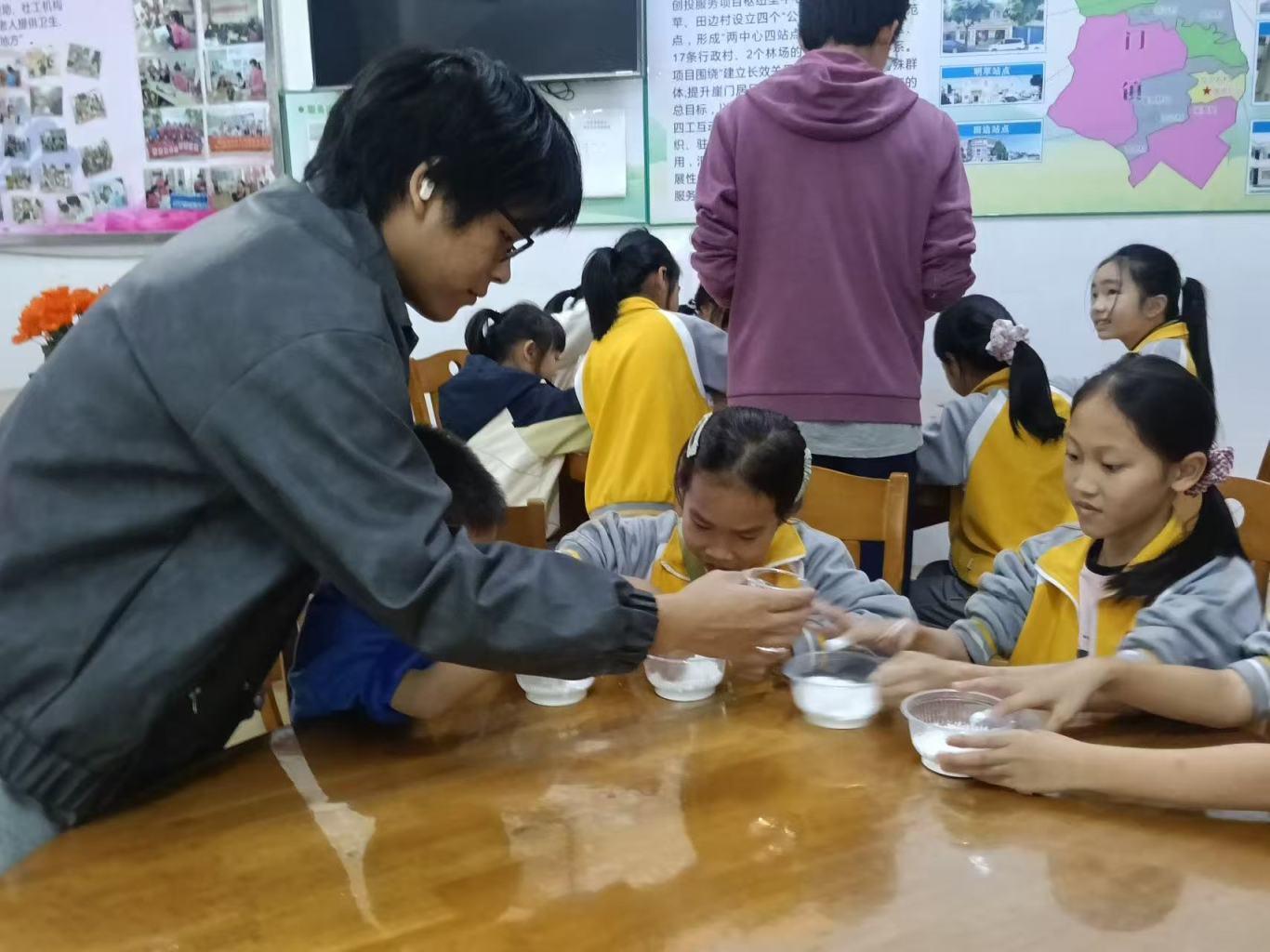 活动前期,志愿者们分工协作,认真清洗各类器具,揉制出光滑软糯的面团,为后续包汤圆活动做好充分准备。面团刚准备妥当,在场的小朋友们便按捺不住兴奋,纷纷围拢过来,满眼期待地等待着体验包汤圆的乐趣。