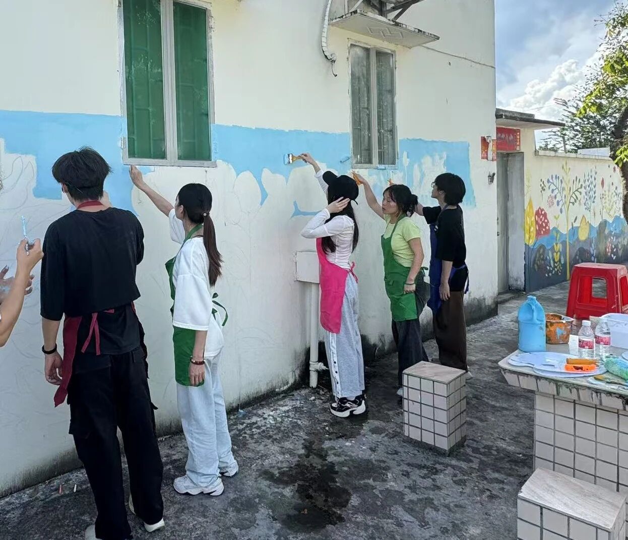 团队成员们分工明确、配合默契。有人负责调配色彩,确保每一种颜料都能精准还原设计稿的要求;有人手持滚筒,细致地为墙面均匀上色;还有人在一旁仔细观察,及时调整色彩的浓淡与衔接。烈日下,汗水浸湿了衣衫,但大家的热情丝毫不减,反而愈燃愈烈。