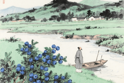 蓝莓园草图——简单勾勒劳作场景升级为水墨蓝莓插画——以传统技法融合现代产业,暗合“农旅融合”规划。