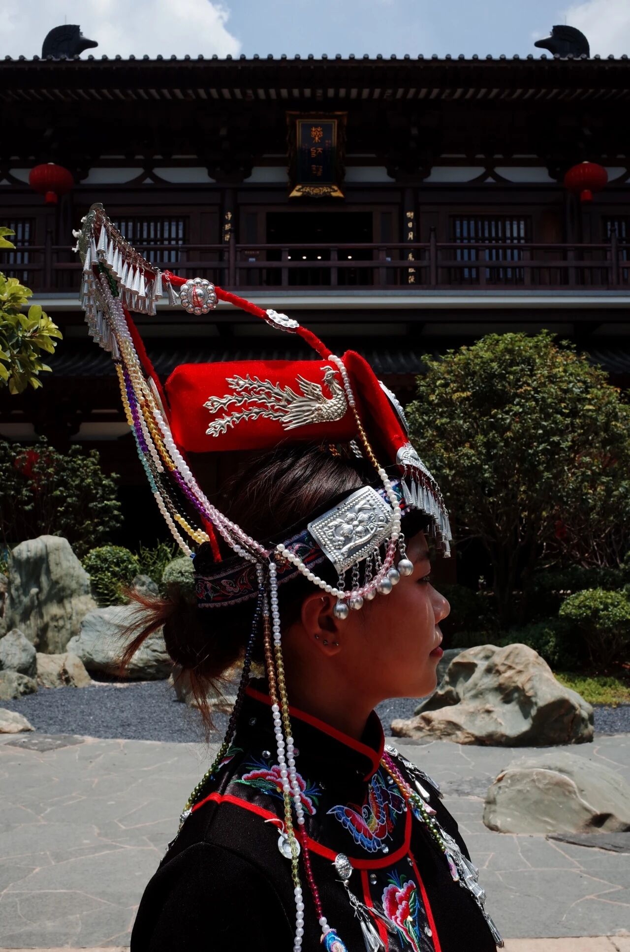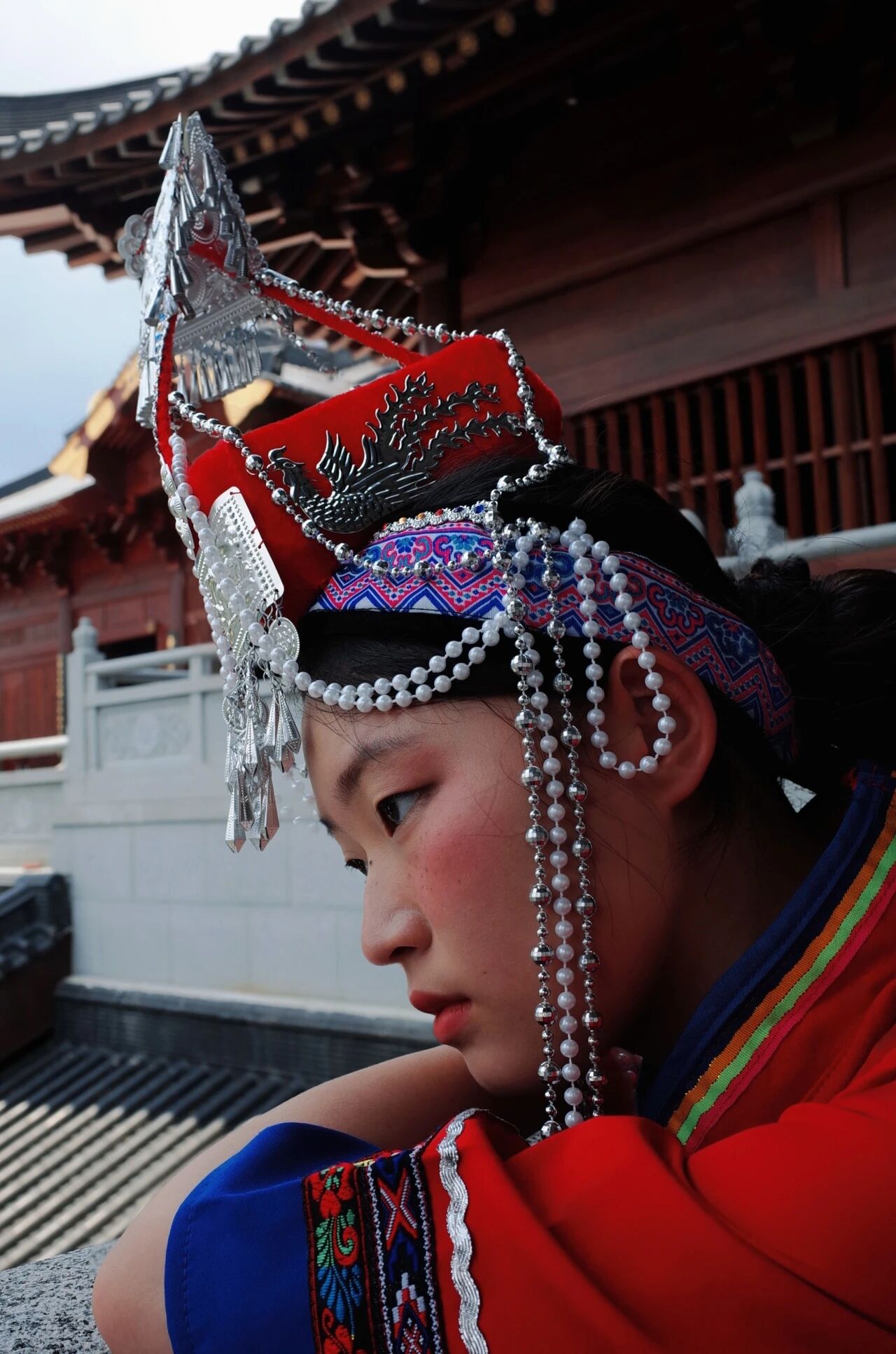 无银不成饰”,是畲族服饰的另一重浪漫。头戴的“凤冠”缀满银花、银片,行走时叮当作响,像把月光穿在了身上;胸前的“银压领”沉甸甸的,刻着吉祥纹样,既是美的装饰,也是长辈对晚辈的祝福与守护。听说过去畲族姑娘出嫁,银饰的多少代表着家族的心意,而每一件银饰都由匠人手工打制,锤击的痕迹里,都是时光的温度。
